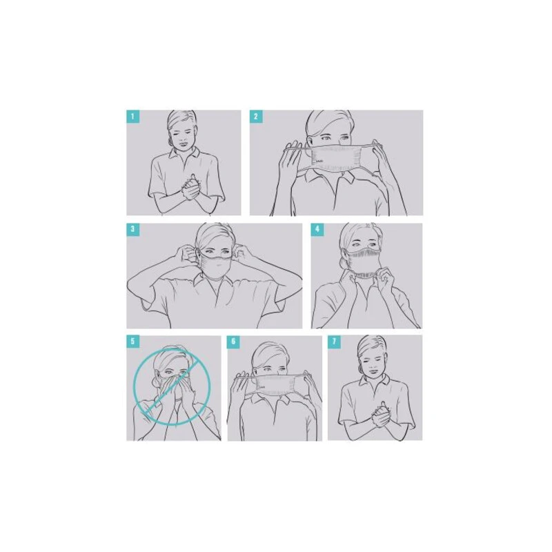 Die Maske ist wiederverwendbar, sie muss bei 60C gewaschen werden – (dann sind die Viren beseitigt), nicht im Tumbler trocknen und nicht Bügeln